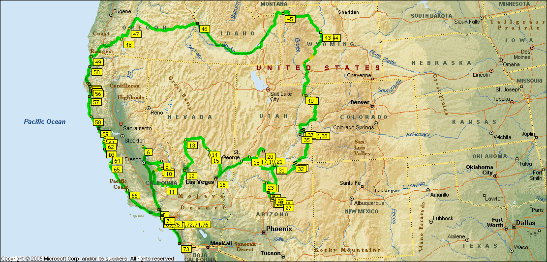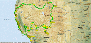 De rondreis die we maken beslaat een redelijk groot deel van het westen van de verenigde staten. gelukkig hebben we 5 volle weken een camper ter beschikking om de rondreis te maken. Na die 5 weken blijven we nog een week in Los Angeles waar we van plan zijn de verplichte bezoeken aan o.a. Universal studios, San Diego Seaworld en meer te volbrengen. Globaal hebben we de route vast gesteld zoals het kaartje aangeeft. (de Gele vakjes met cijfers zijn markeeringspunten op de route. Wij hebben er wat aan. Jullie niet, dus vergeet ze maar).