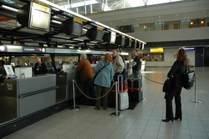 Dat viel toch weer even tegen: de 'wake-up-call' om 5:45 uur in de ochtend. Maar gelukkig bedacht ik mij direct dat we op vakantie gingen, dus dat maakte veel goed. Natuurlijk heb je er dan gelijk weer zin in. Na de gebruikelijke dingen (wasje, plasje, aankleden) snel naar beneden om te ontbijten. Daniel en ik hadden alleen geen flauw idee waar de ontbijtzaal was, maar Kimberly kwam ons gelukkig de wegwijzen (wauw, helemaal naar boven op de 4de verdieping, dus dan weten jullie dat ook gelijk te vinden). Na het ontbijt (ik heb niet meer op dan 1 sneetje brood en vooral koffie op) zijn we de koffers en andere spullen gaan halen. Je moet ons eens zien lopen bepakt en bezakt over schiphol. Even inchecken (zie foto)