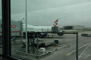 en dan door de douane.Bij de douane moesten we dan toch afscheid nemen van Saskia, Rene en Kimberly. Door de douane en snel nog even zwaaien naar de uitzwaaiers en dan natuurlijk eerst tax-free shoppen voor de noodzakelijke luchtjes en rookwaar. Na een laatste mogelijkheid voor ons om te roken en iets te drinken (bij de Holland casino bar) gingen we richting gate D16 waar ons vliegtuig voor de trip naar London al klaar stond. Een Airbus A320 van British Airways. Het toestel vertrok zoals gepland om 09:50 uur. De vlucht naar London Heathrow was zoals verwacht niet meer dan opstijgen - snackje eten - landen. Alles is rustig verlopen alleen het taxien naar die verre startbaan bij schiphol duurt bijna nog langer dan het vliegen zelf (nauw ja, bijna dan). We landden op London Heathrow om direct door te gaan naar het echte werk. Maar eerst moesten we natuurlijk wel van Terminal 4 naar terminal 1. Incl. de extra controles duurt dat ook nog enige tijd, maar we waren toch nog ruim op tijd voor de Jumbojet die ons in LA moest gaan brengen.