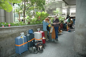 Ik wil dan ook graag hier alle horrorverhalen naar het rijk der fabelen verbannen. We werden heel aardig geholpen door een man die volgens ons echt het stereotype van de amerikaanse politieman was. Zeer waarschijnlijk maakte het wel degelijk uit dat we onszelf natuurlijk als een familie presenteerde, want we waren er zo doorheen. Natuurlijk wel eerst de tegenwoordig verplichte vingerafdrukken (alleen de beide wijsvingers) en foto. Anders ging het met een man die al enige tijd voor ons in de rij stond en dus ook al een tijdje bezig was met een andere "department of homeland security" medewerker voordat wij zelf geholpen werden. Toen wij klaar waren en richting de koffers gingen stond die man er nog steeds. Hoe het afgelopen is weet ik natuurlijk niet want wij moesten door. De koffers waren ondertussen al naast de baggageband gezet door enkele heel snel heen en weer rennende luchthavenmedewerkers, dus die konden zo meegepakt worden. Na een laatste controle bij de eigenlijke US customs waarbij ze niet eens een echte controle uitvoerde stonden we na 200 meter lopen ineens buiten midden in Los Angeles.