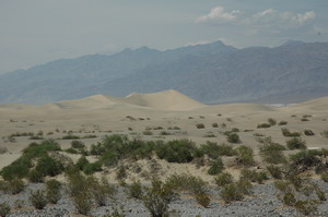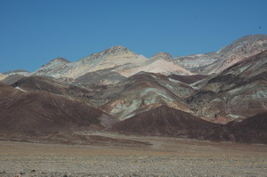 Daarna weer verder. Het eerste interessante fenomeen waren de zandduinen. (zie foto) Die leken inderdaad zoals je zal vermoeden erg op van die, door de wind opgeblazen, duinen in de Sahara woestijn. Toch ook wel leuk om eens zelf te zien. Na met een rotgang langs het Furnace Creek visitors centre gereden te zijn, (hadden we geen zin in) draaiden we iets later Badwaterroad op. Op de route van Badwaterroad was Artist Drive het eerste wat we wilde gaan bezichtigen. Artist Drive is een gebied in de rotsen waar je de mooiste kleuren te zien krijgt, waaronder allerlei pastelkleuren. Helaas de weg die er naartoe loopt is afgesloten voor voertuigen die langer zijn dan 25ft. (en laat onze camper nu net 30-31ft. zijn) Dus dat ging mooi niet door, want te voet is die afstand niet te doen. Zeker niet in die hitte. We hebben het dus moeten doen met foto's vanaf de Badwaterroad. (zie foto's onderaan de pagina) Verderop kwamen we langs de Devils Golfcourse, maar die gingen we onderweg terug bekijken.
