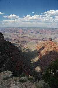 Natuurlijk is dit uitkijkpunt voor ons ook het eerste wat we van de Grand Canyon zien met onze eigen ogen. Ik heb het al meer gezegt, maar de Grand Canyon is echt overweldigend. (veel meer dan de andere parken. Misschien komt Bryce point in Bryce Canyon nog een beetje in de buurt, maar niet meer dan dat) Natuurlijk ook hier bij de shop wat souverniers ingeslagen, want dat mag niet ontbreken. Toen we stonden te kijken naar al die pracht zagen we in de verte, verderop de 'south-rim' een brand. (nouja, alleen de rook dan) Die brand bleek later toen we verder reden een gecontroleerde brand te zijn die is aan gestoken door de lokale brandweer. Dit om het gevaar van natuurlijke branden in te dammen. Hierna zijn we langzaam doorgereden richting Grand Canyon Village. Onderweg natuurlijk gestopt bij de diverse uitkijkpunten langs de route om nog meer te genieten van het prachtige en vooral spectakulaire uitzicht. (zie foto's onderaan de pagina) Bij de village aangekomen hebben we even rondgereden, maar vonden het allemaal verre van bijzonder. Dus besloten we maar weer richting de campground te rijden. De terugweg hebben we via de snelweg 89-zuid afgelegt om halverwege af te slaan, de 180-zuid op. Deze weg gaat door de bergen ten noorden van Flagstaff en ondanks de mindere kwaliteit van de weg was het een welkome afwisseling om eens door de bossen te rijden. Uiteindelijk rijd je Flagstaff in vanaf de westkant. Na de trip door Flagstaff eindigde deze dag weer op de campground van KOA. Het was alweer laat dus snel wat gegeten en weer naar bed. Morgen gaan we weer op pad richting Monument Valley en Arches NP.