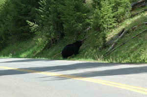 Onderweg terug vielen we nog een paar keer met onze neus in de boter. We zagen iets verderop Rosie lopen met haar cups en daar stond die amerikaan weer in de file om nog even terug te rijden naar de plek van de ontmoeting met Rosie. Hij lacht naar ons en riep: He, Get that yellow schoolbus of the road, You are blocking the road man!! En hij lachte hartelijk. (Die amerikanen hebben echt humor. Zo gezellig) Weer iets verder zagen we nog net een andere moederbeer met twee cups het bos in verdwijnen. (net te laat voor een foto, jammer) Ook zagen we apart van elkaar nog twee andere beren. (Wauw, wat een dag, 10 beren totaal)