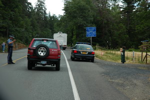 We ontbeten dus niet erg vroeg (is ook wel lekker natuurlijk) en gingen maar weer op pad. Na een sneller en saaie rit door het zuidelijke deel Oregon kwamen we bijna bij de grens met Californië toen het overige verkeer ineens iets langzamer ging rijden. Er bleek verderop een ongeluk gebeurd te zijn. en de Oregon State Police stond het verkeer erlangs te geleiden. Ik greep naar mijn fototoestel deed snel mijn raam naar beneden. hangend uit het raam was ik nog net op tijd om een foto te nemen van de politieagent en zijn auto. het is door de moeilijke houding en de snelheid waarmee ik moest handelen geen scherpe foto geworden, maar ik wil hem jullie niet onthouden.