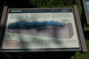 Hier werd ook direct gewaarschuwd voor de gevolgen van een aardbeving die in de kustgebieden een Tsunami kan veroorzaken. Hierna begon onze tocht door de bossen vol met Redwood bomen. We reden door de bossen met Redwood bomen en langs enkele stadjes. De super hogen bomen waren we nog niet tegen gekomen maar die zouden vanzelf komen. Helaas bleek later dat je dan echt de weg af moest en een stuk de bossen in moest lopen. (al wisten we dat de echte kampioenen pas morgen aan bod zouden komen als we de Avenue of the Giants gingen rijden) we kwamen er pas achter toen we een stuk verder het laatste park bijna uitreden en nog even stopte bij het zuidelijk visitor center. (wat stom zeg, en we hadden nog niet eens foto's gemaakt) We hadden weinig zin om weer terug te rijden over de erge kronkel weg die door de bossen liep en vooral over de heuvels) Helaas dus geen foto's van die mooie bomen. Wel heb ik een stuk gefilmd dus we kunnen dit stuk Redwood bos gelukkig nog altijd terugzien op film. (maar daar hebben jullie nu niets aan)