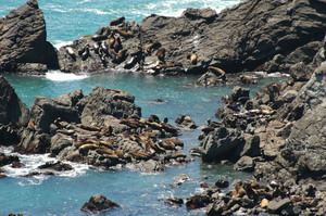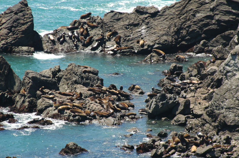 Wel kwamen we op een gegeven moment weer even langs de kustlijn te rijden en daar besloten we nog even te stoppen en van het uitzicht te genieten. Toen we stilstonden en ik de deur opendeed hoorde ik een luid geluid. Wat was dat? Even luisteren en toen wist ik het. Het was het geluid van zeehonden. (of eigenlijk Californische Zeeleeuwen) Het bleek dat we precies op een plek gestopt waren waarvandaan je prachtig op een rotspartij uitkeek waar een hele kolonie van die dieren lag te zonnebaden. Wat een toeval.