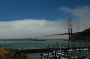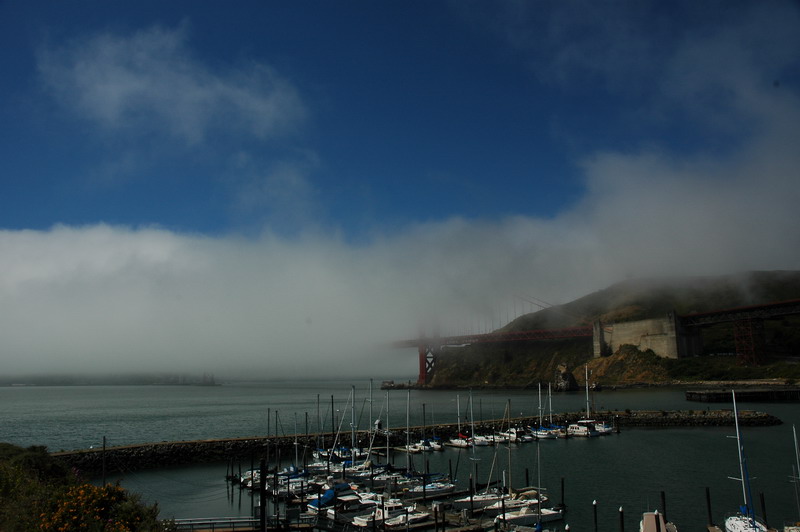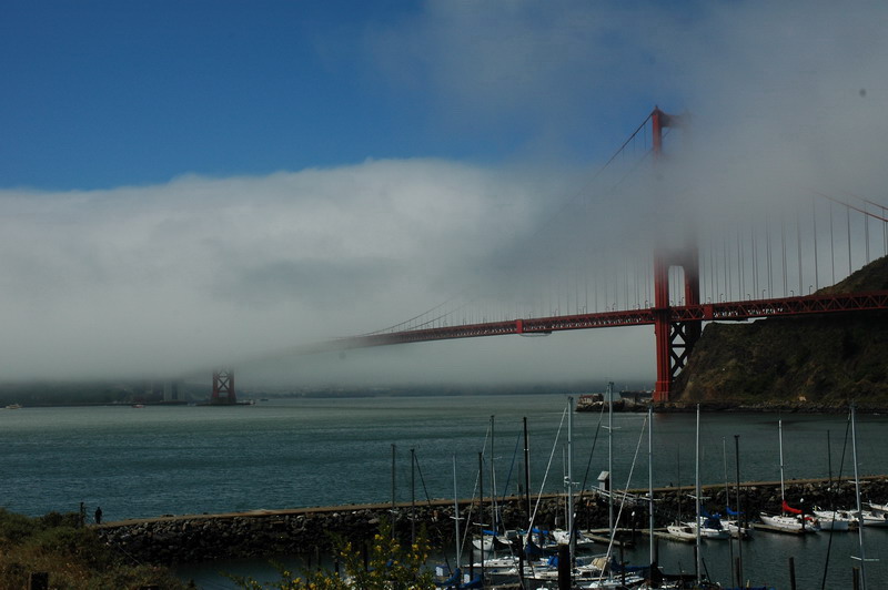 Vadaag wordt weer een saaie reisdag. We gaan van noord San Francisco naar Los Angeles. Dat wordt alleen maar rijden, rijden en nog eens rijden, Bah. Maar als je weg gaat moet je ook weer een keer terug komen (in ons geval dan) Vroeg op om maar niet te laat weer aan te komen. We hadden voor vandaag nog één bezienswaardigheid op het programma en jullie kunnen wel raden wat dat is...... Natuurlijk de Golden Gate Bridge. We zijn dus naar de oostkant (de kant van de SF bay) van het recreatie gebied gereden om bij Fort Baker een eens blik te werpen op de wereld beroemde brug. Toen we aan kwamen rijden zagen we de gevreesde mist al over de heuvels trekken, dus we dachten al dat we niet veel te zien zouden krijgen. En dat was ook zo. Gelukkig kwamen er wel zo nu en dan wat openingen in de mistbank die de brug omhulde zodat we toch nog wat te zien kregen en we nog wat mooie sfeer foto's hebben kunnen maken.