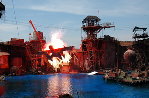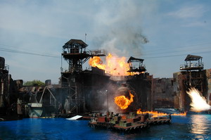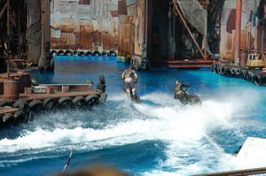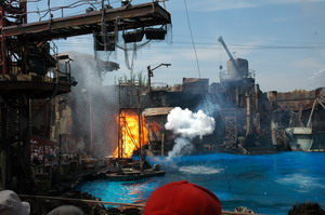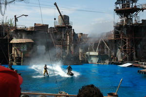 Hiena hebben we een rit gemaakt in de achtbaan van 'Revenge of the Mummy'. Deze achtbaan gaat niet over de kop, maar compenseerd dat geweldig door de start en de rest van de rit. Whaauw, wat een start. Zo snel zijn we nog nooit afgeschoten door een achtbaan. Toen kregen we een uurtje vrijaf om te eten. (het was alweer kwart over een) We heben gegeten bij de Panda Express. Een toko met chinees eten, wat erg lekker was. Om 14:15 melden we ons op de afgesproken plek om de show van waterworld te gaan bekijken. Het was echt verschrikkelijk druk, maar Ira loodste ons via een aparte ingang naar de VIP plaatsen. Tijdens deze show worden de eerst 7 rijen gegarandeerd nat, (voor de show al als vermaak tijdens het wachten of tijdens de show) maar gelukkig zaten wij bovenin. Ze spelen hier het gevecht/de inval in de drijvende stad na. (voor de mensen die de film gezien hebben) Wat een spectakel. zeker met al die explosies en vooral als het vliegtuig crash in de drijvende stad. Geweldig gewoon. Dit is verreweg de beste show die we ooit gezien hebben.